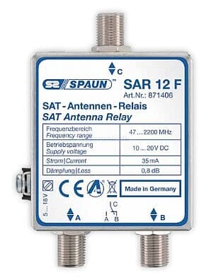 Spaun SAR 12 F SAT antenna relay. Switch between two inputs and downlead in one cable. Control switching via 0 / 12 volts DC.